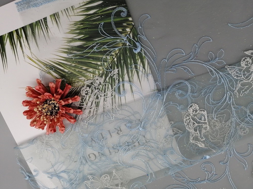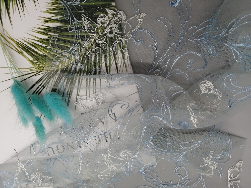 - Bule Tulle Mesh Foil Printed Foil Coated Embroidery Fabric Seluruh penjual untuk Garment Brand memenuhi persyaratan OEKO-Tex Standard 100.