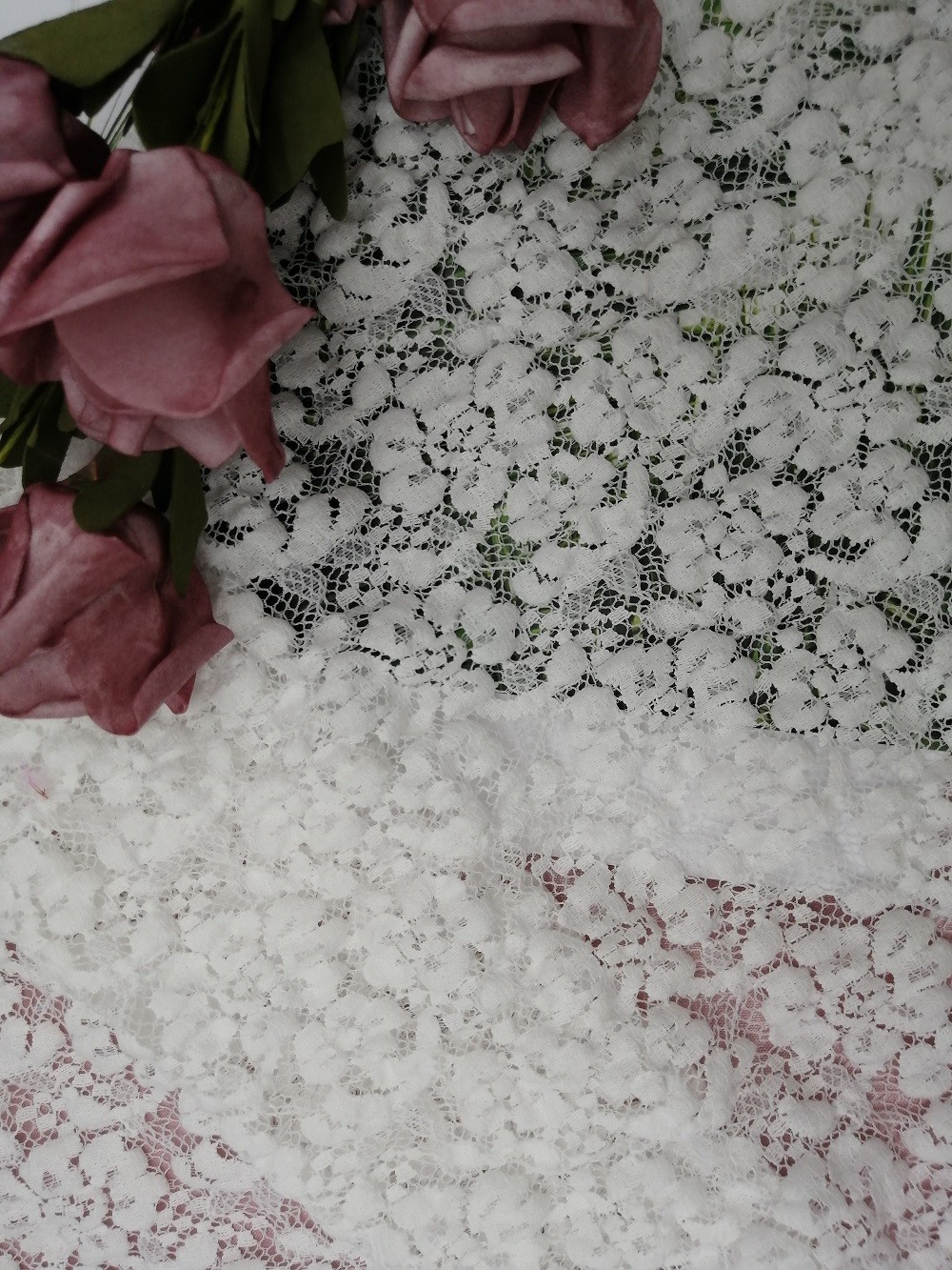 -Renda Spandex PutihKain Renda Peregangan Kain untuk Gaun Malam Kaos Bawah Kaos Tekstil Rumah Gaun Gadis Kecil dapat memenuhi persyaratan OEKO-Tex Standard 100.