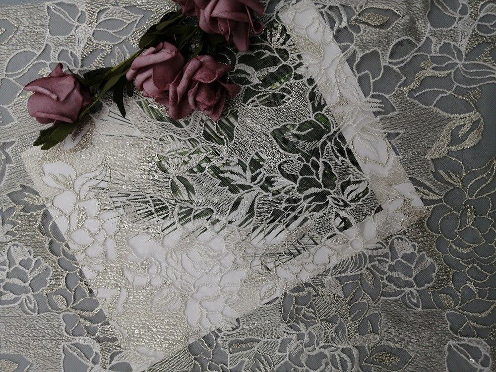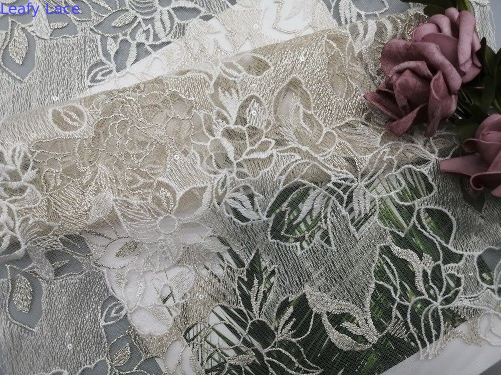 Kain Renda Metalik Ivory Lurex Kain Pesta Payet Kain Bordir Untuk Gaun Pengantin Gaun Wanita Dekorasi pakaian cocok untuk Gaun Wanita, Rok, Gaun Gadis Kecil, Tekstil Rumah, Tirai, Artikel Tempat Tidur, Pakaian, Topi, Gaun Pernikahan, Blus, dll.
