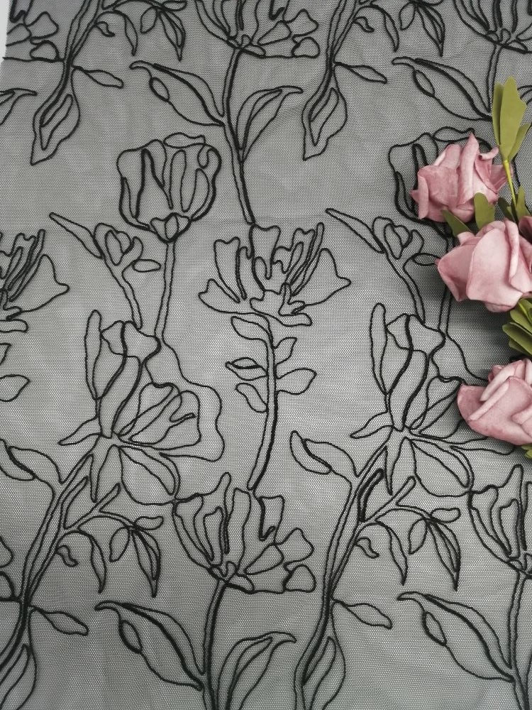 Corded Black Embroidery 3D floral Lace fabric Flower Tulle Mesh untuk Wanita Gaun Rok Panjang Pakaian Gaun Gadis Kecil, Tekstil Rumah, Tirai, Artikel Tempat Tidur, Pakaian, Topi, Gaun Pengantin, Blus, Bahkan Kemeja Pria, dll.