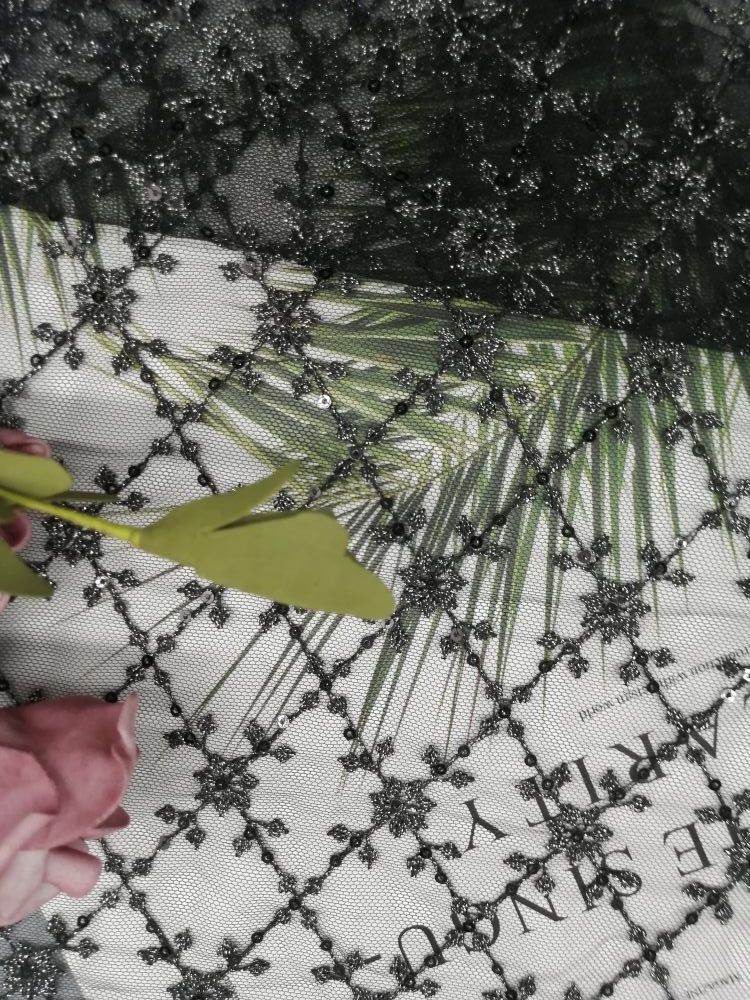 - Lebar 125cm Bordir Glitter Tulle mesh Kain Bordir Payet saya Cmemenuhi persyaratan OEKO-Tex Standard 100 .