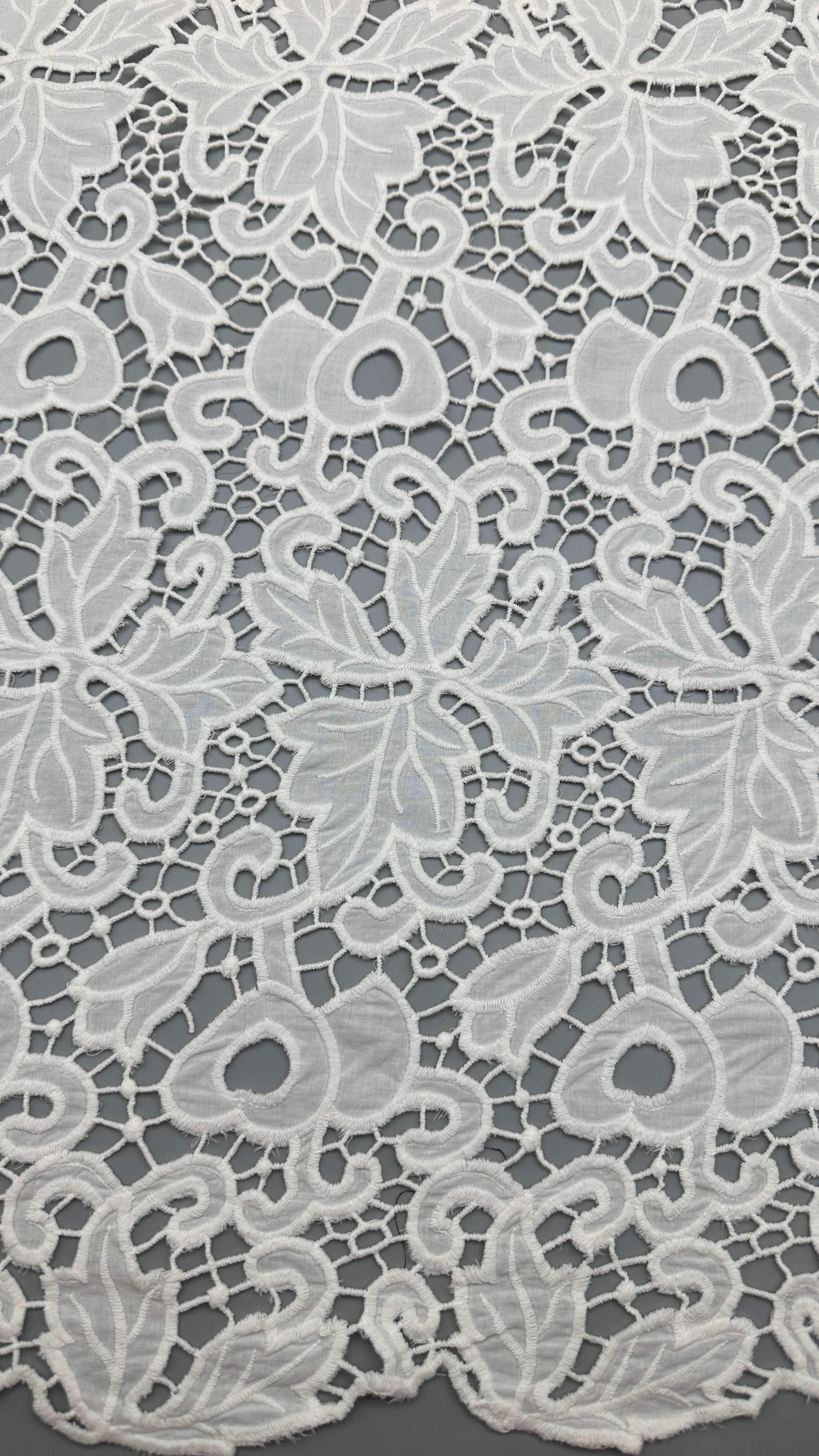 Kain bordir renda dengan motif dedaunan yang halus adalah pilihan populer untuk gaun pernikahan dan pesta, menawarkan keanggunan, tekstur, dan detail yang rumit. Teknologi di balik produksinya melibatkan perpaduan antara keahlian tradisional dan inovasi tekstil modern.
